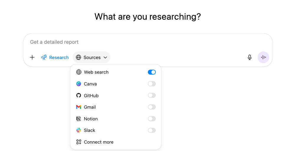 Example: “Conduct deep research to help me decide whether AI copilots or workflow automations are the better investment for a 50-person professional services firm."