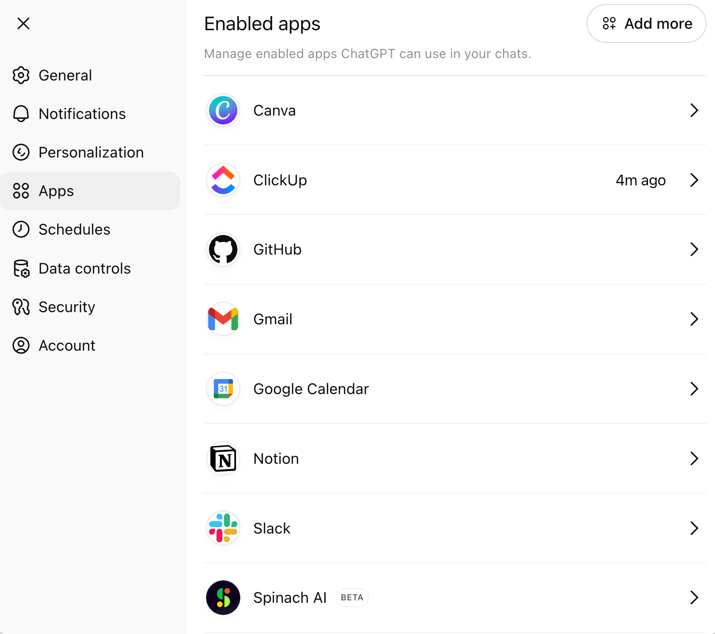 This is where you can connect apps by logging into your account with that app, or add additional app connections. Each week, OpenAI is continually adding more apps to connect with, so check in frequently to ensure you are connected to the most updated suite of apps.