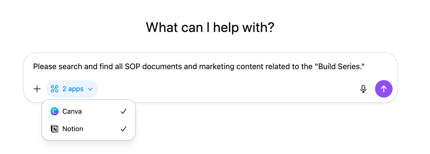 To ensure apps are enabled in your search, toggle on the apps you need, or Company Knowledge, on using the “+", then selecting the apps (see below).