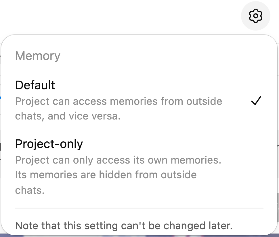Consider whether you want the memory to be siloed to the documents within this project (Project-only), or if you want the project to have access to managed memory (Default). Configure that using the settings button.