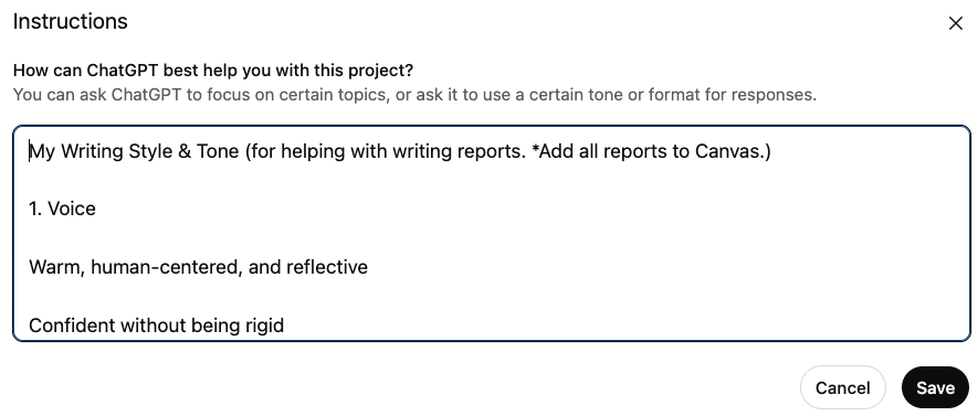 - [Report/ Writing Based Tasks] AIRhack: Something I love to do is upload an authentic piece of my own writing and to ask ChatGPT to describe my writing style, as if it were talking to another AI. The response will be detailed and often better articulated than I could have. After reviewing the description, I take that output and put it into my project’s instructions and tell it to “always apply this writing style when creating reports/ emails/ appeal letters for me.”